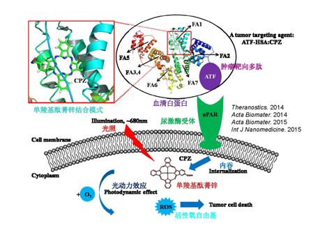 图3. Bifunctional drug carrier ATF-HSA targets to tumors through tumor marker (urokinase receptor, uPAR) and enhanced permeability retention (EPR) effect, and demonstrated enhanced photodynamic therapeutic (PDT) effect. ATF-HSA also carries diagnostic and cytotoxic agents (CPZ in this case) to destroy and/or detect tumor cells.