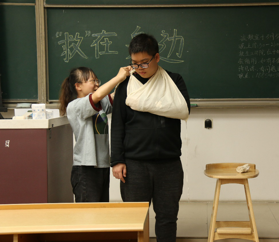 在短短几小时的培训中,红十字会队员们为同学们详细演示了几种急救包扎,如头部包扎、手部包扎、膝盖包扎、断掌包扎、上肢包扎、断指包扎等等。同学们兴致盎然,纷纷进行了实践。随后,队员们边解说边演示了心肺复苏的方法和操作要点,在同学们实践后队员们也对其进行了指导和纠错。最后,同学们观看有关心肺复苏的视频。