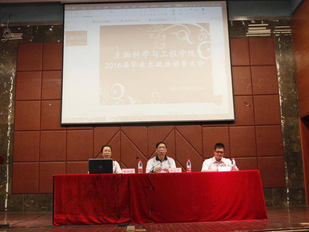 10月13日下午,威尼斯wns88855562016届毕业生就业动员大会在嘉锡厅召开,出席该会议的有生工学院党委副书记郑延平,就业指导中心专家黄贵闽老师与12级辅导员林婧烨老师,参加该会议的是12级全体学生,林婧烨老师为此次会议的主持人。
